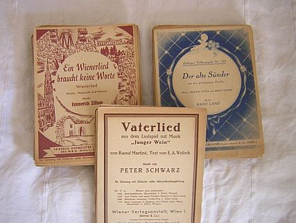 Es handelt sich durchwegs um vierseitige Heftchen mit den Schlagern der damaligen Größen der Unterhaltungskomposition (Oskar Schima, Robert Stolz, etc.), für Gitarre, Harmonika, etc. gesetzt; ungefähr 50 Heftchen aus den Verlagen Doblinger, Arion, Hofmeister-Figaro, etc. Eine genaue Liste kann verschickt werden.